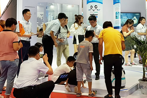 智能語(yǔ)音對(duì)話機(jī)器人正在展會(huì)上和小朋友對(duì)話互動(dòng)呢,這是機(jī)器人展會(huì)現(xiàn)場(chǎng),小朋友和機(jī)器人都很認(rèn)真對(duì)話交流呢...