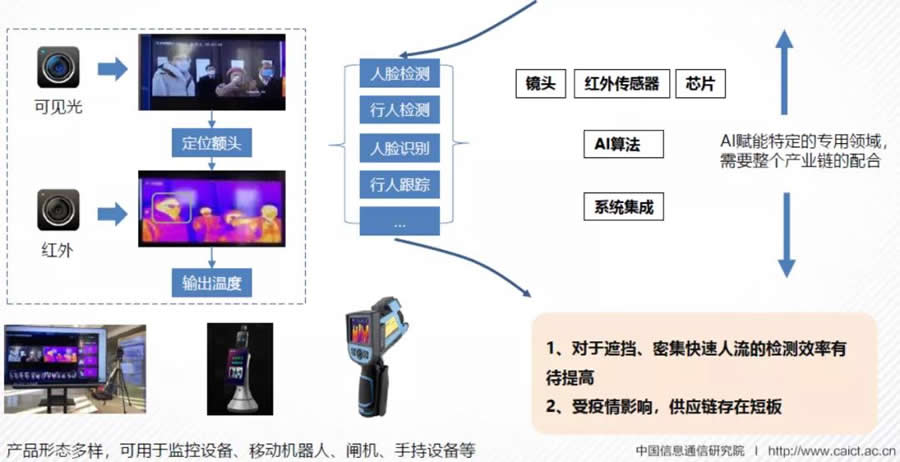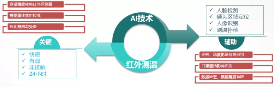 AI體溫檢測(cè)的關(guān)鍵在于紅外體溫。測(cè)溫精度不足,僅可對(duì)人員進(jìn)行初篩;受環(huán)境因素影響較大,遠(yuǎn)距離測(cè)溫?zé)o法解決;測(cè)溫精度修正成為AI未來(lái)的突破重點(diǎn);相關(guān)技術(shù)和產(chǎn)品亟需制定標(biāo)準(zhǔn)規(guī)范。AI技術(shù)在復(fù)雜環(huán)境下的遠(yuǎn)距離紅外測(cè)溫方向上仍需深耕。