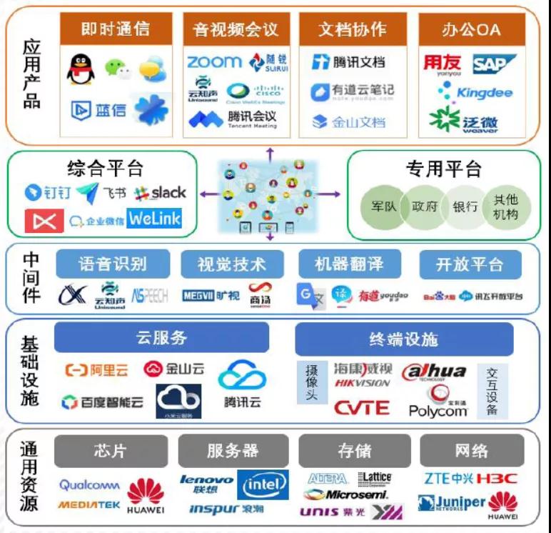 國(guó)內(nèi)在線辦公起步較晚,但發(fā)展迅速且產(chǎn)業(yè)鏈條完整,如圖23所示。國(guó)外在線辦公軟件起步較早,用戶付費(fèi)意愿較G。受到疫情影響,國(guó)內(nèi)在線辦公受到熱捧,有望培養(yǎng)用戶習(xí)慣,并形成可持續(xù)的商業(yè)模式。據(jù)國(guó)外機(jī)構(gòu)Apps Run The World數(shù)據(jù),2018年排名前10位的協(xié)作軟件供應(yīng)商占協(xié)作整體市場(chǎng)的55.7%,其中微軟以占L20.8%的市場(chǎng)份額L跑市場(chǎng),其次是思科、谷歌、LogMein和Slack。我國(guó)協(xié)同辦公市場(chǎng)規(guī)模也呈逐年擴(kuò)大趨勢(shì),據(jù)不完全統(tǒng)計(jì),國(guó)內(nèi)提供協(xié)同辦公產(chǎn)品的企業(yè)約有500余家,2019年產(chǎn)業(yè)規(guī)模達(dá)到459.5億元。即時(shí)通訊:國(guó)內(nèi)互聯(lián)網(wǎng)公司技術(shù)和市場(chǎng)成熟;微信、釘釘、飛書、藍(lán)信等處于L先地位。音視頻會(huì)議:Zoom和思科Webex占據(jù)龍頭地位;國(guó)內(nèi)飛書、釘釘?shù)燃闪藭?huì)議功能,也有專注視頻會(huì)議的隨銳、全視通等。文檔協(xié)同:微軟憑借office軟件在占據(jù)著先發(fā)優(yōu)勢(shì);金山得益于WPS office 的深耕,市場(chǎng)占有率逐步提G。辦公OA:國(guó)內(nèi)辦公OA歷史較長(zhǎng),主要企業(yè)包括用友、SAP、金蝶、金和、致遠(yuǎn)互聯(lián)、泛微等。適應(yīng)國(guó)內(nèi)習(xí)慣和需求,本土企業(yè)優(yōu)勢(shì)明顯。
