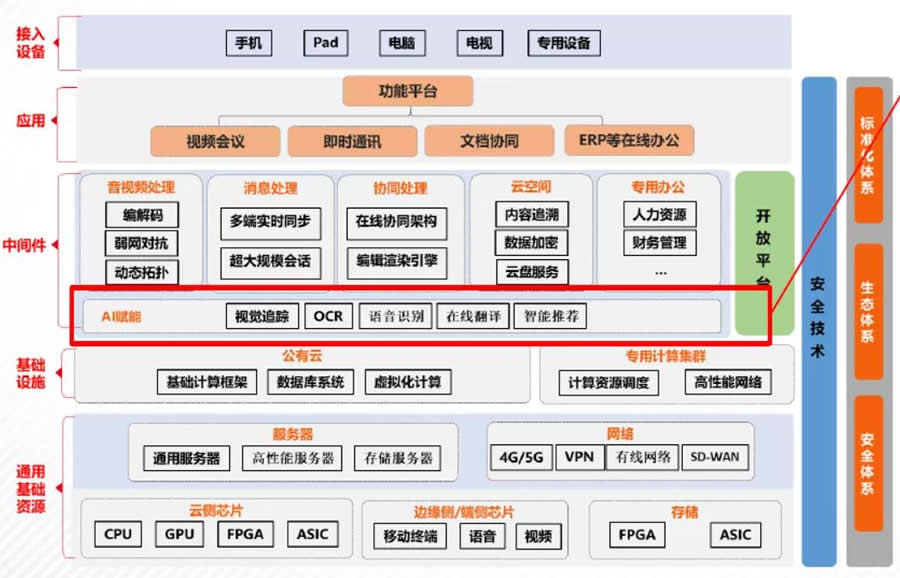 AI賦能協(xié)同辦公系統(tǒng),如圖22所示,提升辦公軟件性能。AI技術(shù)主要是讓在線辦公系統(tǒng)更加智能,提供更出色的用戶體驗(yàn)。網(wǎng)絡(luò)質(zhì)量預(yù)測(cè)。用于動(dòng)態(tài)調(diào)整網(wǎng)絡(luò)拓?fù)、編碼方式等,保證通信質(zhì)量。人臉識(shí)別技術(shù)驗(yàn)證身份,提升會(huì)議系統(tǒng)的安全性。對(duì)視頻質(zhì)量進(jìn)行動(dòng)態(tài)改善,提升交流體驗(yàn)。利用語(yǔ)音識(shí)別和翻譯技術(shù),實(shí)現(xiàn)會(huì)議字幕生成和翻譯。AI在協(xié)同辦公軟件中可發(fā)揮的作用有待進(jìn)一步挖掘。