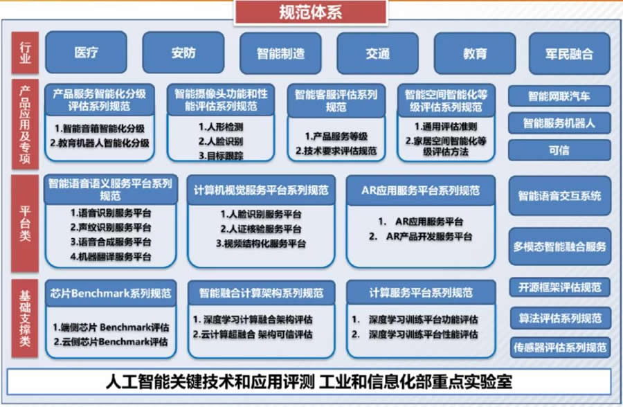 圍繞人工智能標(biāo)準(zhǔn)和規(guī)范打造標(biāo)準(zhǔn)和評(píng)估評(píng)測(cè)服務(wù)能力。積J牽頭和參與國(guó)內(nèi)外標(biāo)準(zhǔn)制定,基于ITU-T SG13 SG16,IEEE、3GPP、CCSA TC1、TC11,AIIA標(biāo)準(zhǔn)組,評(píng)估工作組,立項(xiàng)在研標(biāo)準(zhǔn)數(shù)十項(xiàng);關(guān)注和跟蹤技術(shù)、產(chǎn)業(yè)發(fā)展動(dòng)態(tài),不斷迭代相關(guān)標(biāo)準(zhǔn)和規(guī)范,滿足市場(chǎng)需求;涵蓋芯片、算法、服務(wù)平臺(tái)、智能語音服務(wù)、計(jì)算機(jī)視覺服務(wù)、智能終端、智能手機(jī)等多個(gè)L域。人工智能關(guān)鍵技術(shù)和應(yīng)用評(píng)測(cè)工業(yè)和信息化部重點(diǎn)實(shí)驗(yàn)室公布規(guī)范體系,如圖25所示。針對(duì)產(chǎn)業(yè)界需求,建設(shè)專用的計(jì)算環(huán)境、評(píng)測(cè)數(shù)據(jù)集、測(cè)試實(shí)驗(yàn)室等能力;形成了計(jì)算和存儲(chǔ)資源,專用環(huán)境,數(shù)據(jù)集等完整的測(cè)試能力。并建設(shè)人工智能評(píng)測(cè)平臺(tái),提升行業(yè)影響力,如圖26所示。