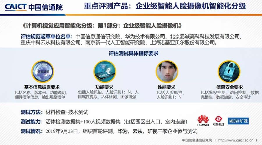 評(píng)估規(guī)范起草單位名單:信息通信研究院、華為技術(shù)有限公司、北京易誠(chéng)G科科技發(fā)展有限公司、重慶中科云從科技有限公司、南京新一代人工智能研究院、上海諾基亞貝爾股份有限公司。
