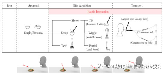 喂食是一項(xiàng)復(fù)雜的任務(wù),創(chuàng)建用于進(jìn)食的操作行為分類有助于系統(tǒng)地將其分類為子任務(wù)。通過細(xì)分,研究者們可以更好地了解人們在此任務(wù)的不同階段使用的不同策略。通過將喂食任務(wù)分為四個(gè)主要階段:1)休息,2)方法,3)獲取咬痕,4)運(yùn)輸,研究者們制定了與喂食任務(wù)相關(guān)的操作策略的部分分類法(圖3)。