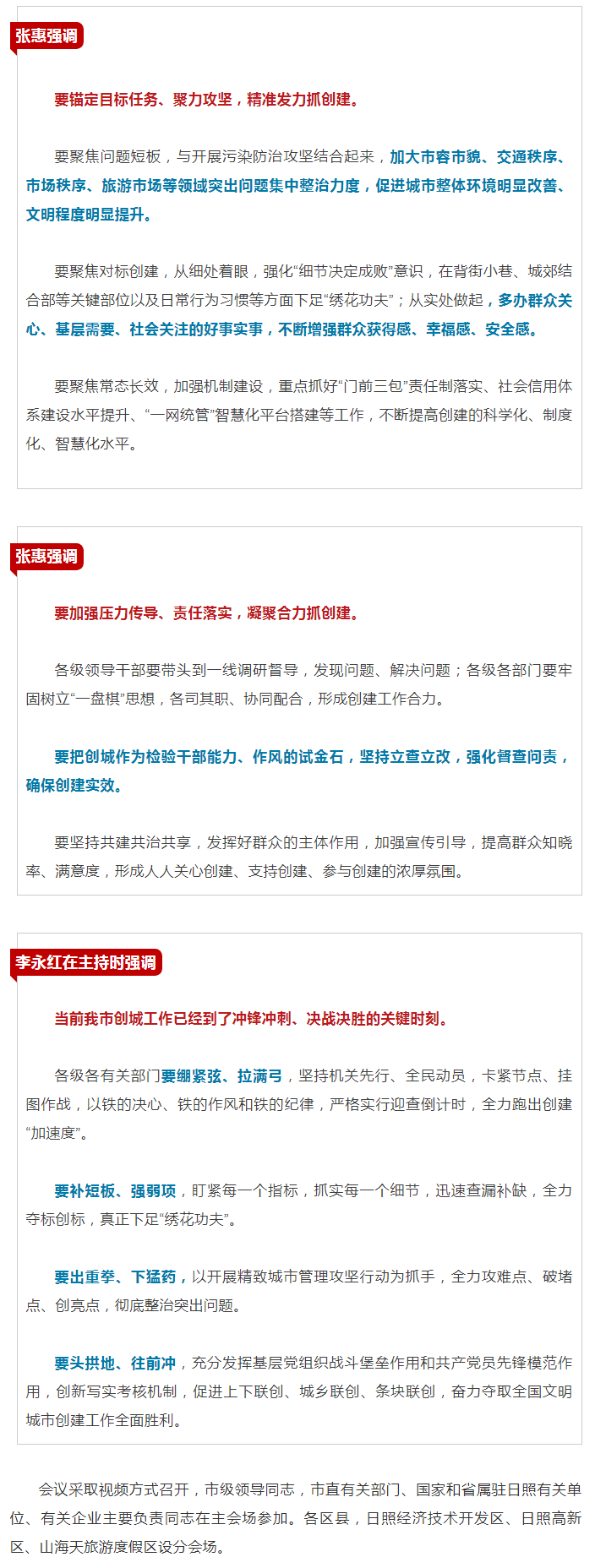 市委書記張惠講話,市委副書記、市長李永紅主持,市政協(xié)主席王斌,市人大常委會(huì)主任G杰,市委副書記李在武出席,市委常委、統(tǒng)戰(zhàn)部長楊留星通報(bào)創(chuàng)城模擬測評情況。東港區(qū)、嵐山區(qū)、日照經(jīng)濟(jì)技術(shù)開發(fā)區(qū)、日照G新區(qū)、山海天旅游度假區(qū)、市城市管理局、市市場監(jiān)管局、市公安局交警支隊(duì)負(fù)責(zé)同志作表態(tài)發(fā)言。